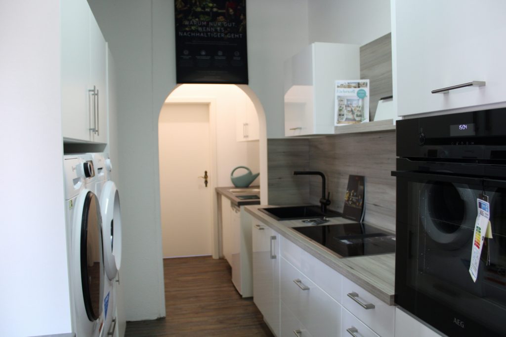 Entdecken Sie unsere neueste Kollektion von Konzum Küchen, die speziell für kleine Räume konzipiert wurden und alle grundlegenden Küchenelemente sowie zusätzlichen Stauraum für Waschmöbel umfassen.